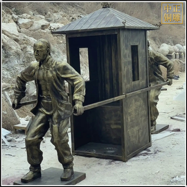 中正铜雕-抬轿子景观人物雕塑、抬轿子景观人物雕塑价格额、抬轿子景观人物雕塑厂家,我公司集科研、开发设计、普通铸造、一次性整体浇铸、精密铸造于一体。本公司技术力量雄厚,设备,不但重视中国青铜器原有的艺术风格,还继承了文物原有的艺术品味,在继承和发扬古老文化的同时,更深一步为新老客户定身量制各种铜制、铁制工艺品等产品,曾多次受到寺庙长老和美术学院教授的好评。